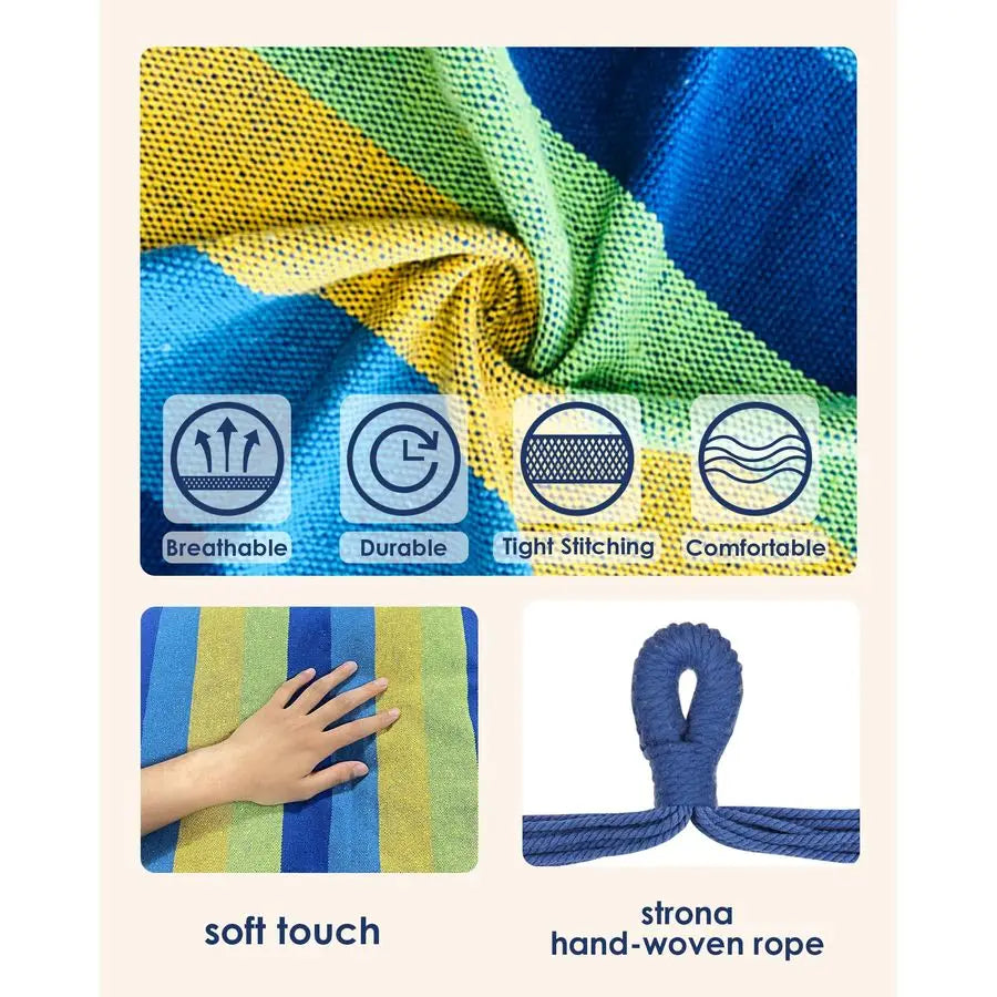 RELIABLE amp DURABLE This hammock is handcrafted from soft and durable polyester cotton ropes and canvas fabric, it brings great softness, durability and comfort.